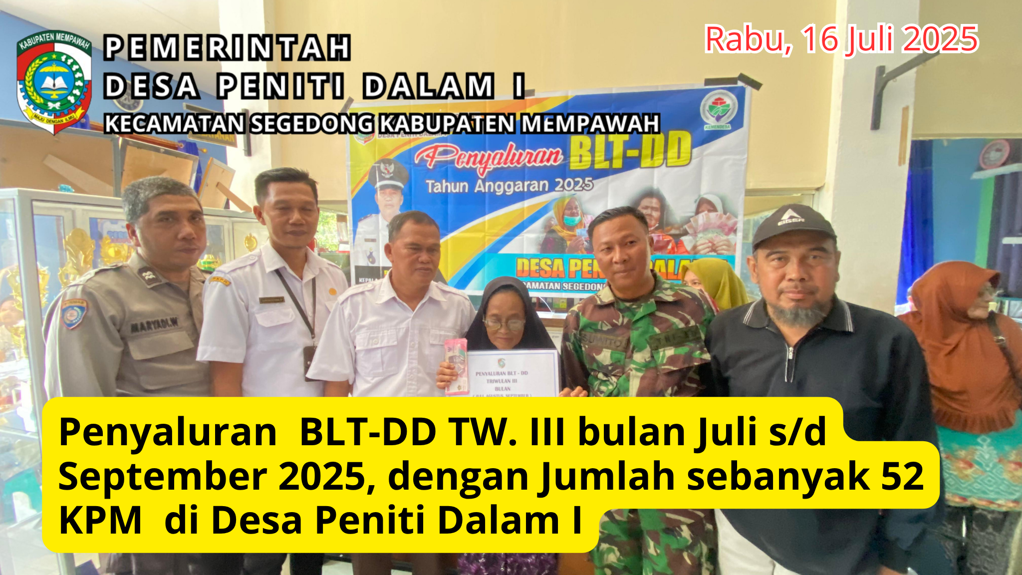 Rabu, 16 Juli 2025 ; Giat penyaluran BLT – DD TW. III bulan Juli s/d September Tahun 2025 di selenggarakan oleh Pemerintah Desa Peniti Dalam I, kegiatan ini merupakan Tahap Triwulan ke 3 Tahun 2025 ini dengan Jumlah KPM Sebanyak 52 Keluarga Yang merupakan Warga Desa Peniti Dalam I yg Rentan terhadap Kemiskinan, dalam kegiatan … Baca Selengkapnya